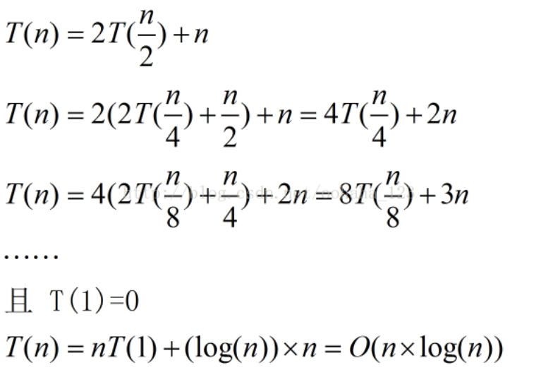 最好情况下是O(nlogn),其中递归算法的时间复杂度公式:T[n] = aT[n/b] + f(n),推导如下所示: