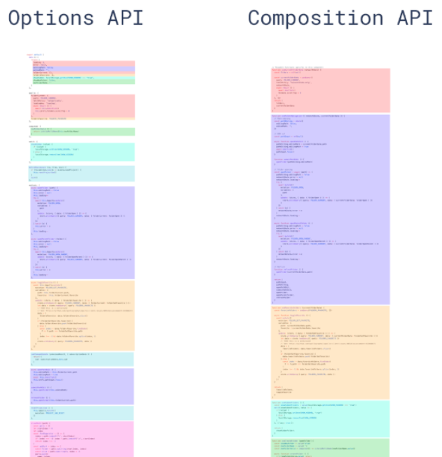 再来一张图进行对比,可以很直观地感受到 Composition API在逻辑组织方面的优势,以后修改一个属性功能的时候,只需要跳到控制该属性的方法中即可